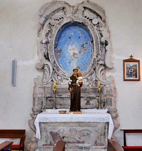 Apsida je podijeljena kamenom pregradom s dvama vratima, pa se u stražnjemu dijelu nalazi sakristija, a prednji dio zauzima restaurirani glavni oltar posvećen Sv. Josipu. Unutrašnjost crkve stradala je u pljački i požaru 1991. godine, a sav crkveni inventar i krovište su uništeni. Unutrašnjost je crkve bila bogato opremljena s dva drvena kora, tri kamena oltara i dvije drvene barokne propovjedaonice simetrično postavljene na uglovima zidne stijene koja dijeli apsidu od naosa.